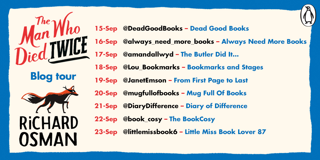 Having thoroughly enjoyed The Thursday Murder Club, my review of which you’ll find here, I was delighted to be asked to join the blog tour for Richard Osman’s second book in the series, The Man Who Died Twice. My thanks to Ellie Hudson at Penguin for inviting me to participate and for sending me a copy of The Man Who Died Twice in return for an honest review.