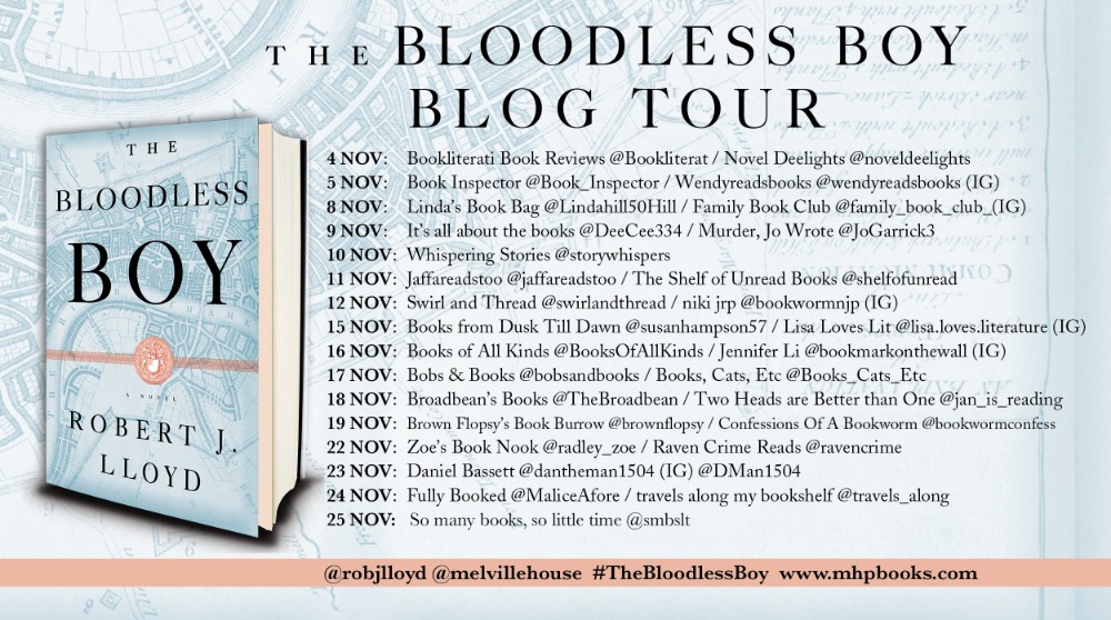I’m very fond of historical fiction and would like to thank Nikki Griffiths for inviting me to participate in the blog tour for Robert J. Lloyd’s The Bloodless Boy and for sending me a copy of the book in return for an honest review. It’s a privilege to share that review today.