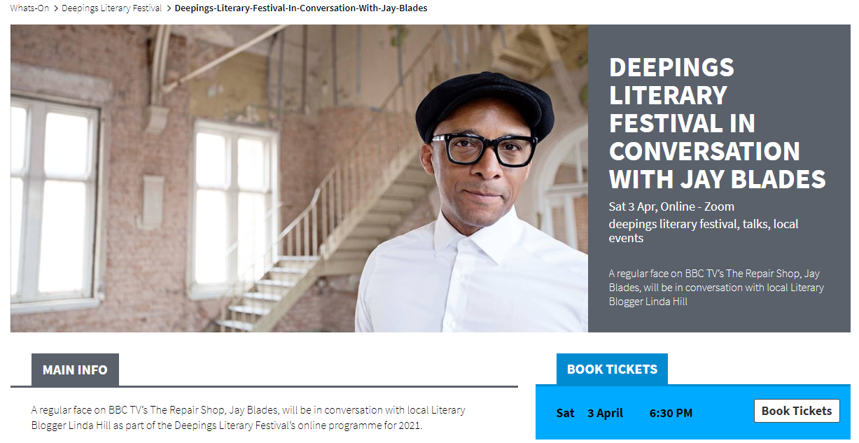 I also interviewed Jay Blades of The Repair Shop about his memoir Making it in an online event for The Deepings Literary Festival. You’ll find my review of Making It here.