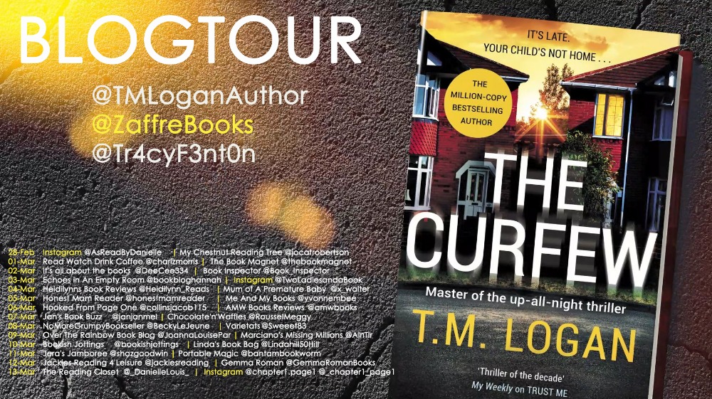 I’ve a confession. I’ve been meaning to read T.M. Logan’s books for ages and although I’m trying not to take on new blog tours I simply couldn’t resist taking part in this one for The Curfew because I’d heard such good things about his writing. My grateful thanks to Tracy Fenton for inviting me to participate. I’m delighted to share my review of The Curfew today.