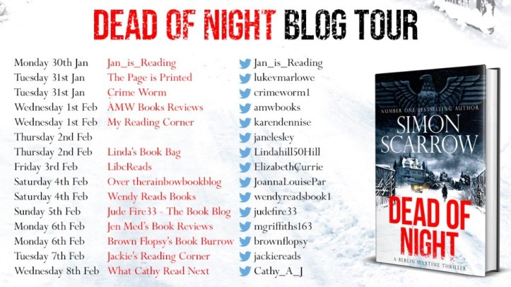 It’s an honour today to host a blog tour extract from Dead of Night by Simon Scarrow. My enormous thanks to Jessica Hunt and Sophie Ransom for inviting me to participate in the tour and for sending me a copy of Dead of Night which I cannot wait to read. Dead of Night is part of the Berlin Wartime Thriller series.