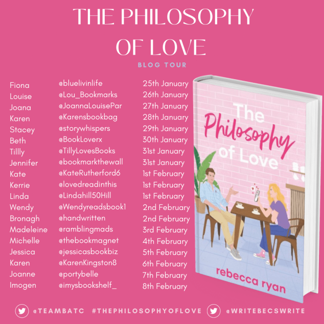 As I love romantic fiction, and having studied philosophy as part of my first degree, how could I resist a book called The Philosophy of Love? Add in the fact that I adored Rebecca Ryan’s first novel, My (extra) Ordinary Life, reviewed here, and I’m delighted to take part in the blog tour for her second book. My huge thanks to Sara-Jade Virtue of Books and the City for inviting me to participate. I’m delighted to share my review today.