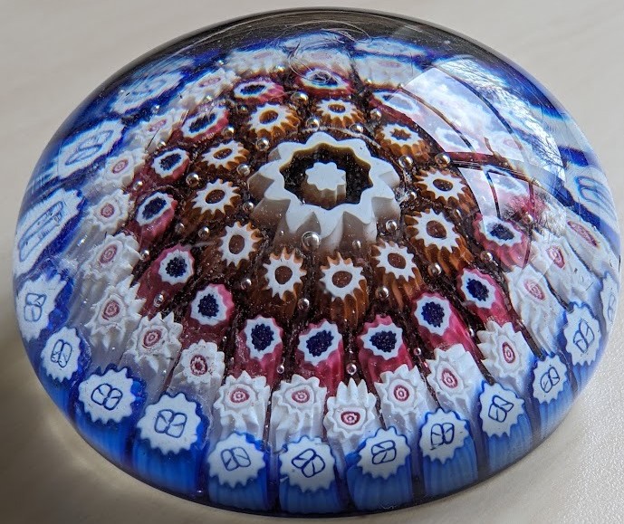 As a young child, I remember setting eyes on my grandfather’s purchase and being drawn by its mesmerising contents and the way it magnified and distorted itself. This shiny, glassy orb with its intricate geometry of bright lapis lazuli, pink and white sunk deep into a sea of solid glass, never ceased to fascinate my young eyes. How did the coloured glass get inside the see-through glass? And how could this iridescent globule of sheer beauty have no more meaningful role in life than a mere paperweight?