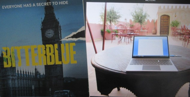 I wrote Bitterblue partly, but not all, in Marrakesh with the hotel rooftop terrace as my office and the all-out attack on the senses which the colours and never-ending din of the Medina below me provided, and with the Atlas mountains as a backdrop (although the novel has nothing to do with Morocco). I’ve brought along the only photograph which I have of my laptop, with the text of Bitterblue as I was working on it visible – and alongside it, what the work eventually ‘became’ (i.e. a physical book to hold and read). ‘Creation’ and ‘product’ together, if you will.